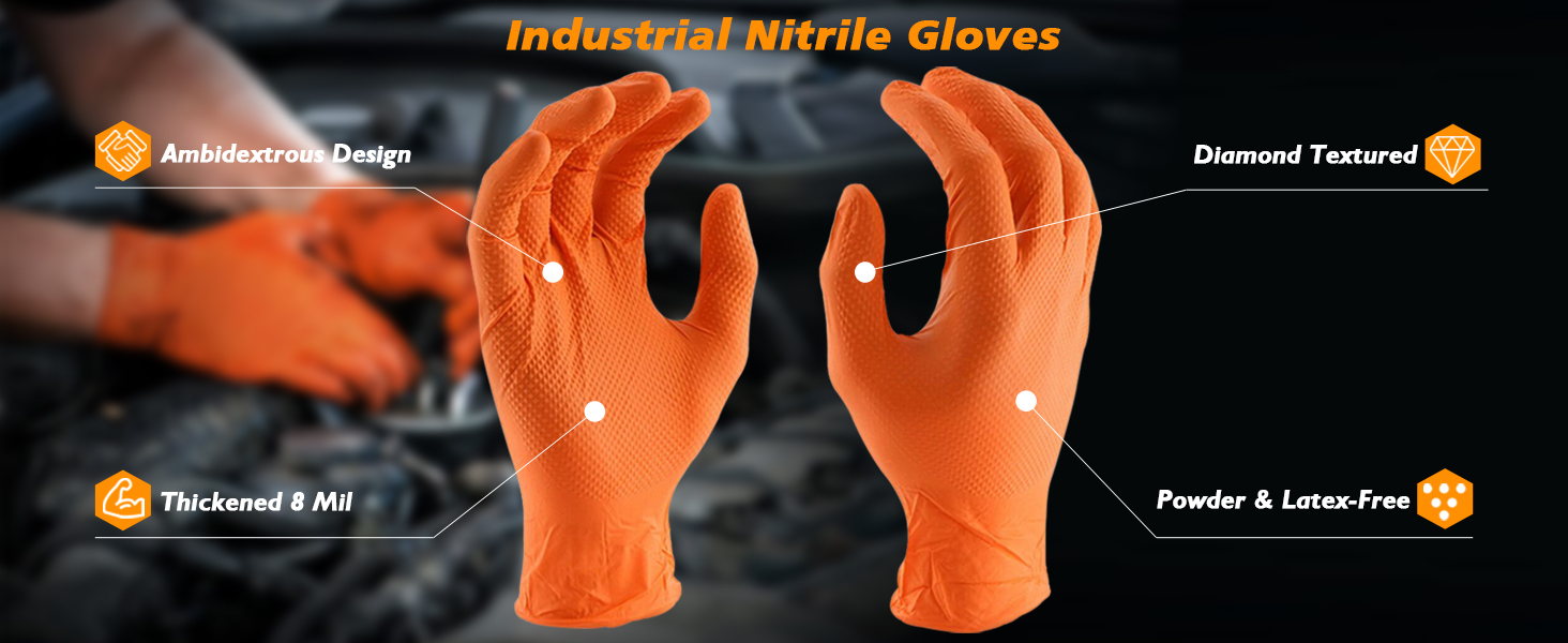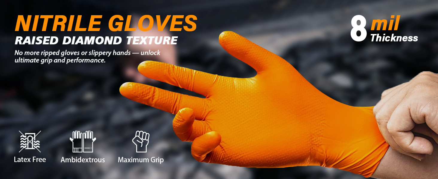 Guardall Orange 8.0 Mil Nitrile Powder-Free Disposable Gloves feature a rugged diamond-textured surface for exceptional grip and control, even in slick or oily conditions. Trusted across industries like aviation, automotive, marine, plumbing, and manufacturing, these gloves are a go-to for professionals who demand durability and performance. With their extra-thick design, they stand up to tougher tasks while shielding hands from harsh chemicals, solvents, and paints.